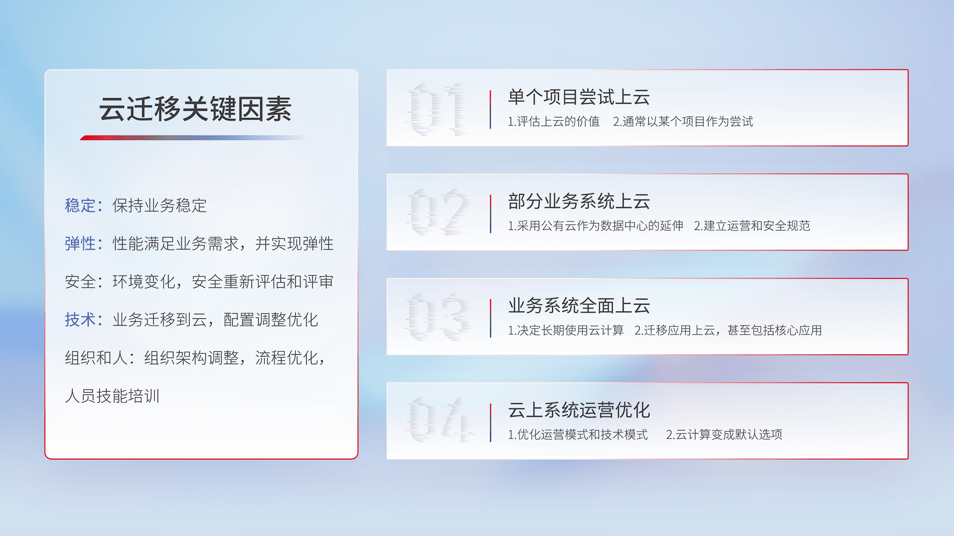 结合实际业务,,从规划设计、、、云平台选型、、、云原生改造、、、数据迁移、、、、集成交付,,,迁移全过程为客户识别最佳上云路径,,做好风险识别管理,,,设计网络架构、、、身份权限、、安全审计合规、、、、操作审计、、、日志审计、、、监控告警策略、、多站点容灾设计等,,,,对云上基础设施进行整体规划,,,,提升IT治理水平,,,,以满足弹性、、高可用、、高性能的需求。。。